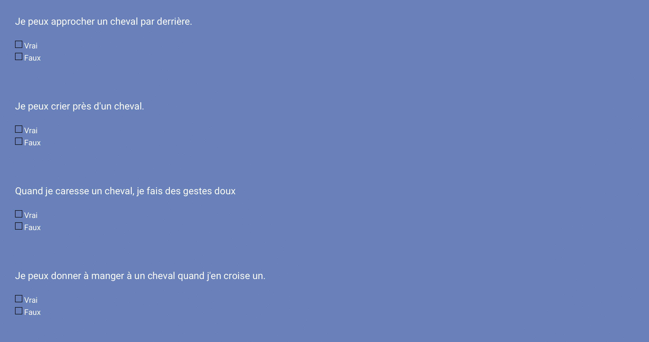 Reconnaître et apprendre Continuer 06/26 Quel animal fait ce cri ? Écouter Cliquer Le cochon Le canard La vache Reconnaître et apprendre Continuer 07/26 Quel animal fait ce cri ? Écouter Cliquer Le cochon grogne Le canard La vache Reconnaître et apprendre Continuer 08/26 Quel animal fait ce cri ? Écouter Cliquer Le cheval L'âne La vache Reconnaître et apprendre Continuer 09/26 Quel animal fait ce cri ? Écouter Cliquer Le cheval hennit L'âne La vache Reconnaître et apprendre Continuer 10/26 Quel animal fait ce cri ? Écouter Cliquer La poule Le canard L'âne Reconnaître et apprendre Continuer 11/26 Quel animal fait ce cri ? Écouter Cliquer Le canard cancane La poule L'âne Reconnaître et apprendre Continuer 12/26 Quel animal fait ce cri ? Écouter Cliquer La chèvre Le mouton La vache Reconnaître et apprendre Continuer 13/26 Quel animal fait ce cri ? Écouter Cliquer Le chèvre bêle Le mouton La vache Reconnaître et apprendre Continuer 14/26 Quel animal fait ce cri ? Écouter Cliquer La chèvre Le lapin La vache Reconnaître et apprendre Continuer 15/26 Quel animal fait ce cri ? Écouter Cliquer Le chèvre Le mouton La vache meugle Reconnaître et apprendre Continuer 16/26 Quel animal fait ce cri ? Écouter Cliquer Le mouton Le canard L'âne Reconnaître et apprendre Continuer 17/26 Quel animal fait ce cri ? Écouter Cliquer Le mouton bêle Le canard L'âne Reconnaître et apprendre Valider 18/26 Quel animal fait ce cri ? Écouter Cliquer L'âne Le mouton La vache Reconnaître et apprendre Continuer 19/26 Quel animal fait ce cri ? Écouter Cliquer L'âne brait Le mouton La vache Reconnaître et apprendre Continuer 20/26 Quel animal fait ce cri ? Écouter Cliquer La poule Le lapin Le coq Reconnaître et apprendre Continuer 21/26 Quel animal fait ce cri ? Écouter Cliquer La poule Le lapin clapit Le coq Comment se comporter avec un cheval ? Les attitudes du cheval Observe les chevaux, regarde leurs yeux, la position des oreilles, la bouche et les nasaux... Et devine comment ils se sentent et si tu peux les approcher ou pas... Pour connaître la réponse, clique sur les images. Continuer Continuer 22/26 Comment se comporter avec un cheval ? Les attitudes du cheval Continuer 22/26 01 02 Quelle est son attitude ? Il approche son museau, sa bouche est fermée, ses nasaux sont ouverts, ses oreilles sont en avant et orientés vers la personne, son encolure également, il est bien posé sur ses quatre pieds et la regarde. Comment se sent-il ? Il est confiant et disponible. Que peut-on faire ? On peut l'approcher et le caresser en lui parlant calmement. Quelle est son attitude ? Ses oreilles sont couchées en arrière, sa bouche est ouverte, on voit ses dents, il pince ses nasaux. Ses yeux sont durs et il évite de nous regarder... Comment se sent-il ? Il est en colère. Que peut-on faire ? Il ne faut pas l'approcher tant qu'il est dans cet état. On peut essayer de lui parler, très calmement pour le calmer. Mais si on n'observe pas de changement d'attitude, on ne s'approche pas. Comment se comporter avec un cheval ? Les attitudes du cheval Continuer 23/26 03 04 Quelle est son attitude ? Il est allongé et se repose. Ses yeux sont fermés et ses oreilles retombent un peu. Comment se sent-il ? Il est fatigué, il dort. Que peut-on faire ? S'il est nécessaire de le réveiller, il faut être prudent parce qu'il a besoin d'un moment (un peu comme nous) pour sortir de son sommeil. Il faut lui parler pour le réveiller doucement et attendre qu'il soit confiant. Quelle est son attitude ? Ses oreilles sont dressés vers le haut, bouche pincée, tendue, son cou est bien haut, droit et étiré. Ses yeux regardent partout avec attention. Les sabots arrières sont en position de départ. Comment se sent-il ? Il est tendu, en état d'alerte, concentré, " prêt à partir". Il a peut-être peur à cause d'un bruit. Que peut-on faire ? Il faut être très prudent. Avant de l'approcher, il faut attendre qu'il se détende - regarder s'il descend un peu sa tête et son encolure. On peut lui parler pour attirer son attention et faire comprendre que tout va bien et qu'il ne doit pas avoir peur. Comment se comporter avec un cheval ? Les attitudes du cheval Continuer 24/26 05 06 Quelle est son attitude ? Deux juments broutent de l'herbe dans un pré. À gauche, la jument mange avec ses oreilles dirigée vers l'autre jument. À droite, celle-ci a une oreille dirigée vers sa copine et une oreille dirigée vers l'extérieur ; elle guette le danger pour elle et sa copine Comment se sent-il ? Elles sont en train de manger. Elles sont à la fois détendues et vigilantes. Que peut-on faire ? Comme nous, le cheval n'aime pas être dérangé quand il mange. Avant de les approcher, il faut leur parler calmement, et patienter qu'elles portent leur attention sur nous, sans leur faire peur. Quelle est son attitude ? On a un cheval qui a le cou étiré vers le haut, la bouche ouverte. Comment se sent-il ? Il est peut intrigué par une odeur. Ce geste s'appelle « un flehmen ». Le cheval a senti une odeur particulièrement intéressante et utilise un organe situé sous le palais, sous la surface intérieure du nez pour l'identifier et le mémoriser. Que peut-on faire ? Cette posture peut-être impressionnante mais n'est aucune agressive. Il ne faut pas avoir peur ; pas de cris ou de mouvements brusques. Comment se comporter avec un cheval ? Les attitudes du cheval Et maintenant, un petit quiz pour tester tes connaissances sur les chevaux. Pour chaque phrase, réponds Vrai ou Faux. Continuer Continuer 25/26 Comment se comporter avec un cheval ? Les attitudes du cheval Valider 25/26 Faux. Car il risque de ne pas de te voir, d'avoir peur, de ruer et de te faire mal. Faux. Les chevaux ont facilement peur et ils n'aiment pas les cris. Vrai. Le cheval est très sensible au toucher quand on le caresse, il faut de la douceur. Faux. Les chevaux ont besoin d'une alimentation bien choisie car leur digestion est particulière