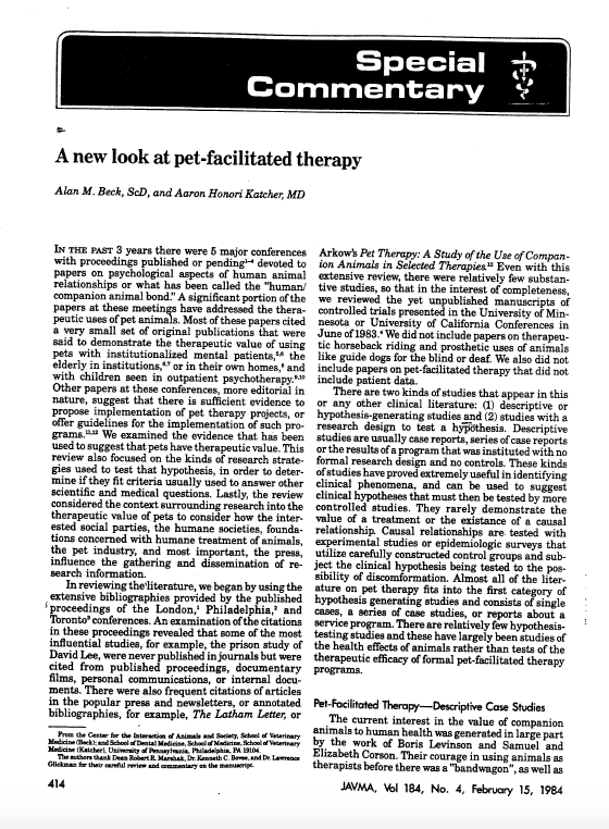 Beck & Katcher, à la suite de plusieurs conférences internationales mettant en avant les bénéfices des relations humain/animal à but thérapeutique, se sont attelés à une revue de la littérature sur laquelle se sont appuyées ces conférences. Après avoir noté la maigreur de la production écrite sur le sujet, ils divisent celle-ci en deux catégories : une littérature descriptive et génératrice d’hypothèses et une littérature expérimentale (avec une hypothèse à tester et un modèle de recherche défini).