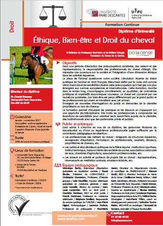 « La formation est destinée aux Hommes de chevaux qui interagissent avec eux et éduquent les pratiquants. Son approche pluridisciplinaire croise le savoir académique porté par l’Université Paris Descartes et l’expérience reconnue des professionnels intervenants au Haras de la Cense. »[vc_btn title= »Consulter le site » style= »custom » custom_background= »#6186c3″ custom_text= »#ffffff » align= »center » link= »url: http://www.scfc.parisdescartes.fr/index.php/descartes/formations/droit/du-ethique-bien-etre-et-droit-du-cheval