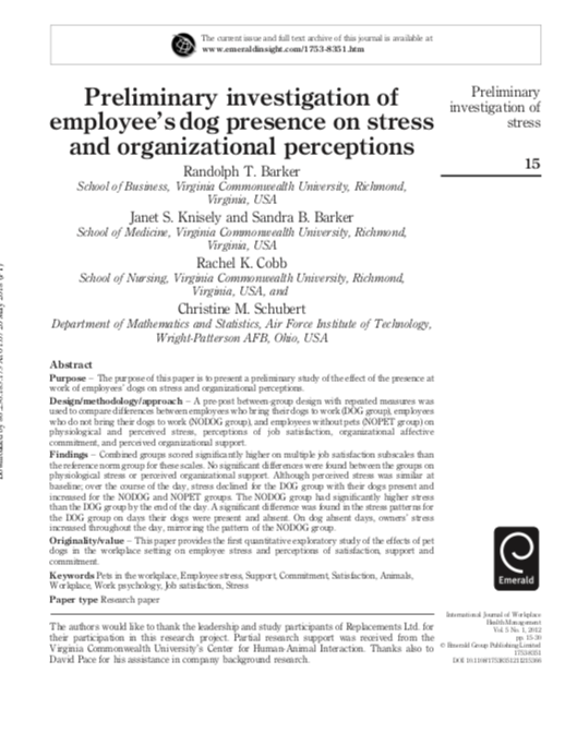Cette étude a été menée pour identifier dans quelle mesure le présence du chien accompagnant son maître sur son lieu de travail pouvait contribuer à diminuer le stress ressenti et ses inconvénients.