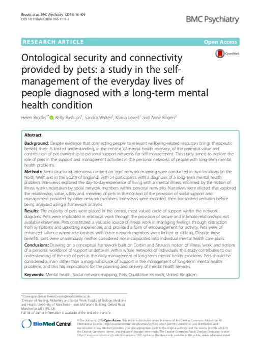Cette étude, menée en Grande Bretagne (Université de Manchester) vise à explorer le rôle des animaux de compagnie dans dans le cadre de leur quotidien pour des personnes ayant des problèmes psychiatriques chroniques.