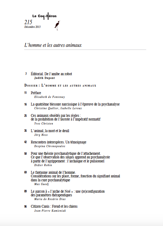 Les auteurs rassemblés dans ce numéro cherchent à montrer à quel point l’homme s’intègre parmi les autres êtres vivants. Il possède, certes, ses caractères particuliers, comme toute autre espèce animale, mais il devra renoncer à l’image privilégiée de roi de la création qu’il a de lui-même. De ce fait, il n’a pas le droit de disposer à sa guise des autres vivants et ne les considérer que de l’unique point de vue de son propre intérêt. Il leur doit respect et considération. L’homme se nourrit d’autres animaux, tout comme d’autres espèces, mais cela ne lui donne pas le droit de les transformer en objets qui n’ont ni sensations ni sentiments. « À travers ses contributions, écrit Elisabeth de Fontenay dans la préface, ce numéro semble effectuer une réévaluation de la responsabilité des praticiens de l’inconscient envers ces vivants dont on a trop longtemps dit qu’ils n’étaient jamais que vivants et auxquels il faut bien désormais accorder un psychisme. » De quelle manière psychanalystes, philosophes, éthologues, primatologues ou ethnologues appréhendent-ils aujourd’hui la fluctuante frontière entre Hommes et Animaux. Quand et comment le fantasme animal vient-il envahir le cabinet du psychanalyste ? Présentation de l’éditeur