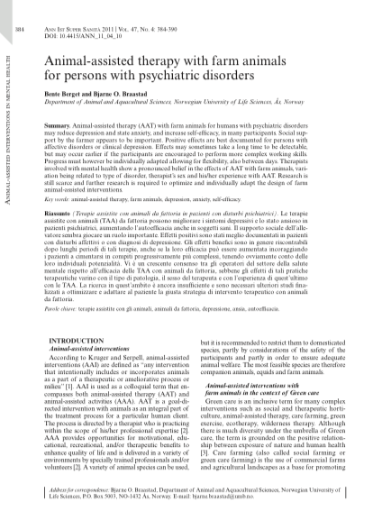 Il a été remarqué que les activités associant l’animal (AAT) à la ferme, proposées à des personnes atteintes de maladies psychiques, pouvaient réduire la dépression et le niveau d’anxiété et améliorer leurs compétences. L’accompagnement par le fermier est important.