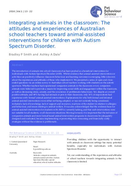Il est reconnu que la présence animale dans les salles de classes a une influence bénéfique pour les enfants souffrant d’autisme en influençant positivement le comportement en classe et les apprentissages. Par contre, ce qu’en pensent les enseignants est peu documenté. D’où une enquête en ligne menée auprès des enseignants australiens qui travaillent avec des enfants autistes.