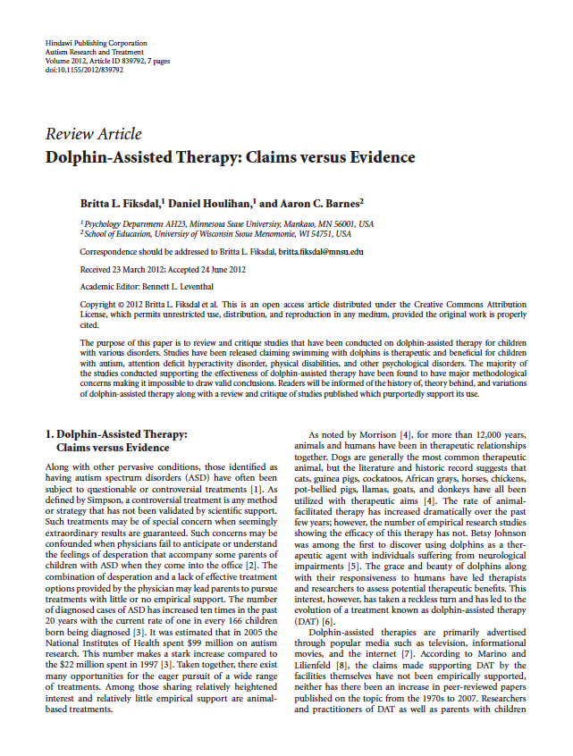 Le lecteur trouvera dans cet article l’historique et la théorie sous-jacente de cette démarche de thérapie assistée avec le dauphin ainsi qu’une revue critique des travaux publiés qui la défendent.